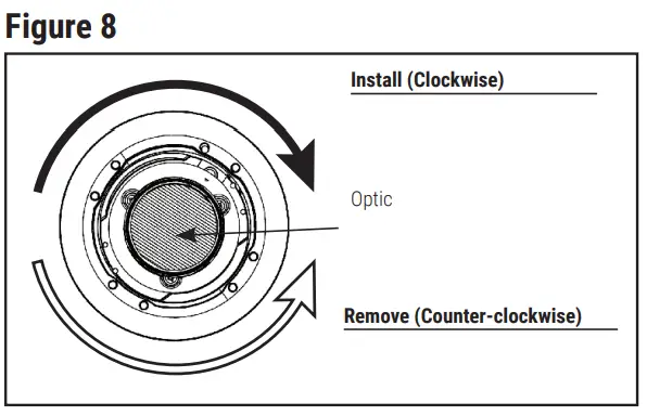 - The optic can be removed and replaced to provide a different beam angle. To remove optic, twist counter-clockwise. To install, insert optic and twist clockwise. (Figure 8 )