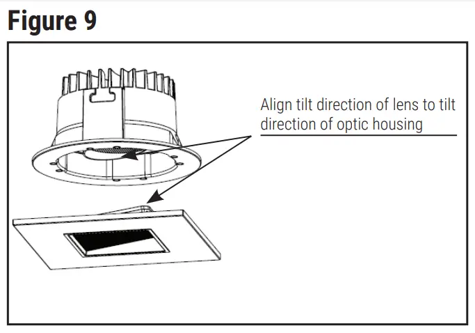 Note: Wall Wash Optic can be installed in 3 positions. Take care to align optic as indicate. - Place square trim over flange of ML4 module already installed into housing. Align tilt direction of lens to tilt direction of optic housing. Magnets will secure and retain trim to LED module (Figure 9).