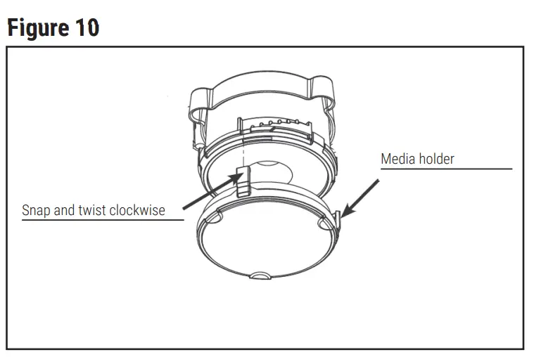 - Also available, is a single/double media holder. To install, place the media onto the media holder. Engage snaps at bottom of snap staircase. Twist clockwise until tight. (Figure 10)