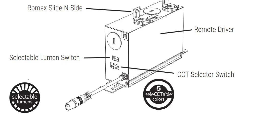 - Place remote driver box thru the cut-out hole and mount according to local code as required.