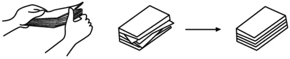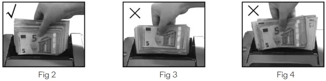 Before inserting, twist the stack of notes to create an even slope (Fig 2). Loosen and pat the stack before placing onto the feeding tray. Figures 3 and 4 demonstrate incorrect procedure.