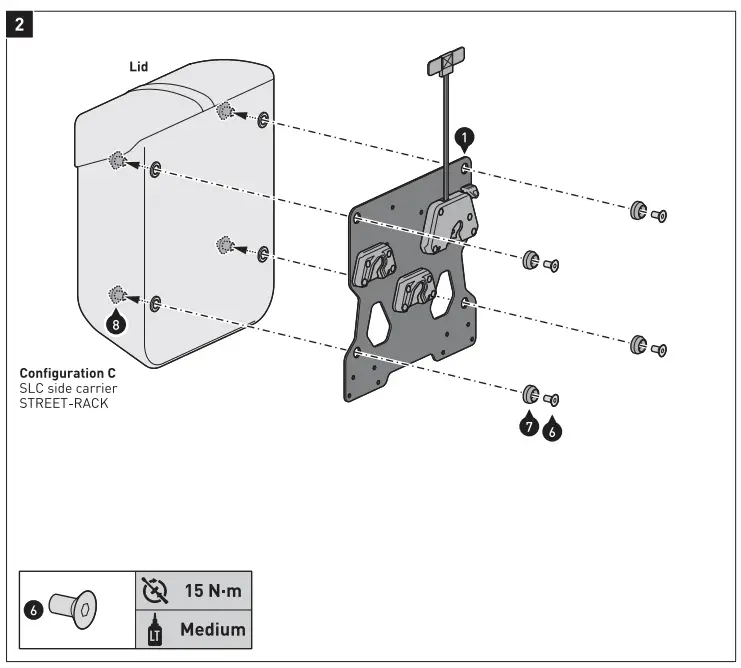MOUNTING: All parts and connections removed from the vehicle must be reinstalled in accordance with the vehicle manufacturer’s specifications or replaced by parts delivered by SW-MOTECH. Secure all threads, unless otherwise specified, with a medium-strength liquid thread locker. Torque specifications undefined by SW-MOTECH must be obtained from the vehicle manufacturer or by a specialist workshop!