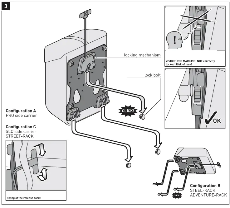 ATTENTION: Make sure that all guide bolts of the adapter kit for SysBag 15/30 engage at the same time! Pay attention to the clearly audible snap sound of the locking mechanism and that the red marking under the slider is not visible! To release press the slider downward or pull the release cord.