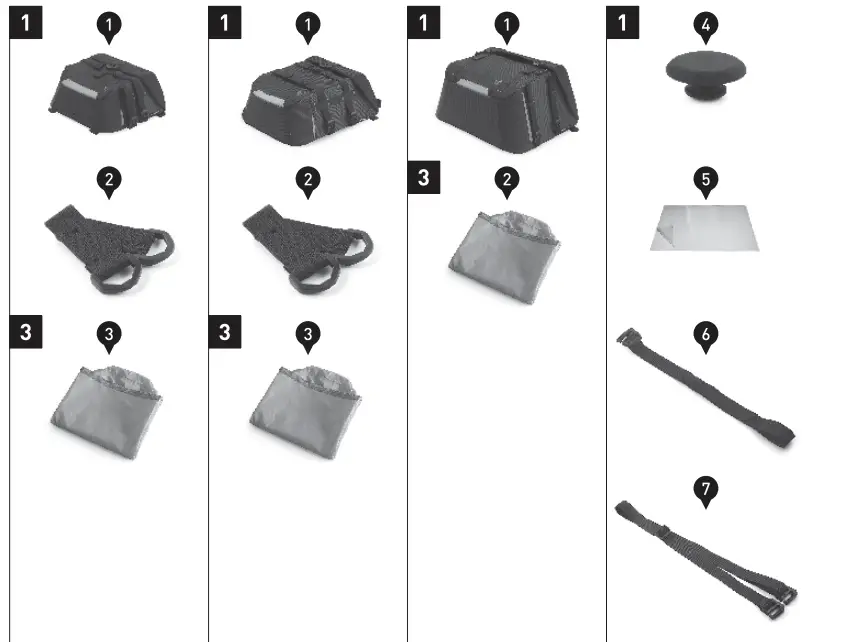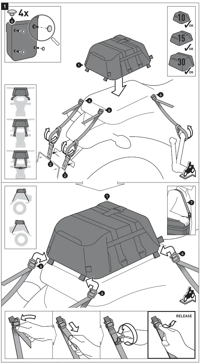 Before fastening your SysBag (1) to the vehicle, the rear eyelets must be closed with the included rubber plugs (4) (shown in the detailed drawing at the topl!