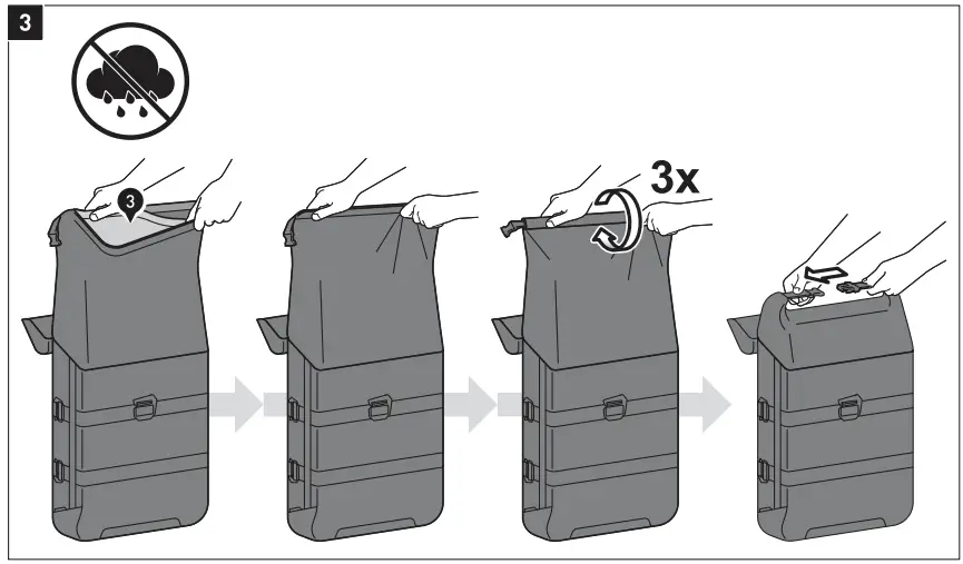 ATTENTION: Always use the included waterproof inner bag (31 to protect your luggage from moisture! Fasten the waterproof inner bag (31 on the inside of the reinforced opening of the SysBag (11. Now roll the reinforced opening three times. Then close the SysBag (1) with the buckles.
