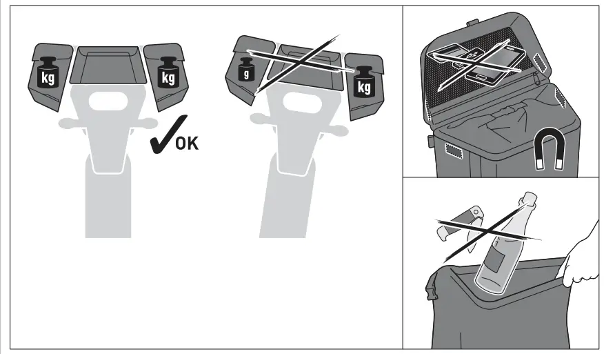 LOADING ATTENTION: Pay attention to keep items and electronic devices that can be damaged by magnetic fields away from the magnets sewn in the lid of the SysBag (11! ATTENTION: Never store pointy or sharp-edged objects, which could cause injury to persons or damage to the vehicle/side case!