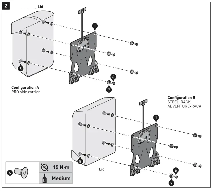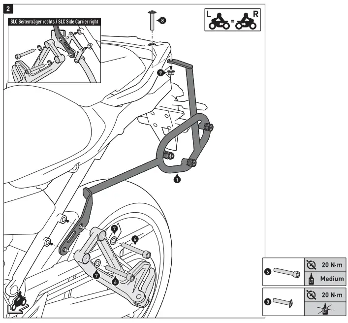 NOTE: When mounting the side carrier with the SW-MOTECH luggage rack, the screws (8I are not required. Use the screws of the luggage rack instead. Attach the side carrier (1) with the passenger footrest mount to the vehicle. NOTE: Attach the brake fluid reservoir holder on the right side as shown in the detailed drawing.