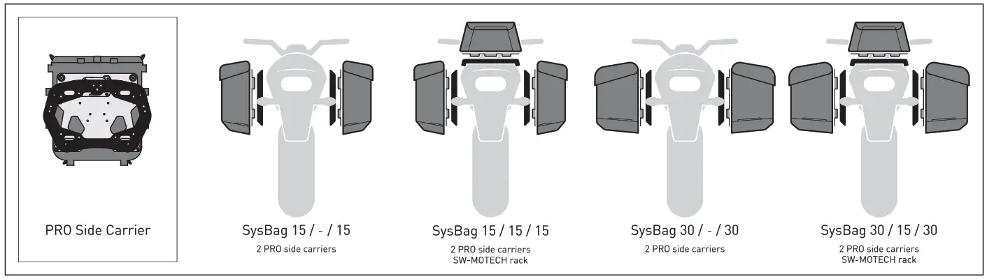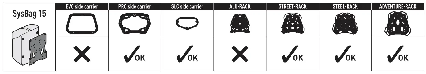 the SysBag 15 onto the guide bolts, until it properly rests on your SW-MOTECH carrier system.