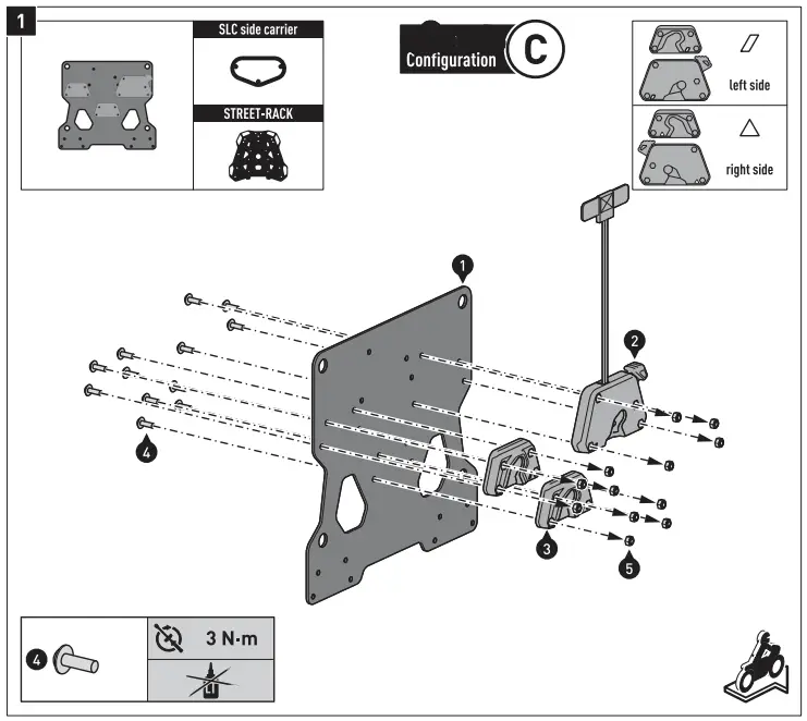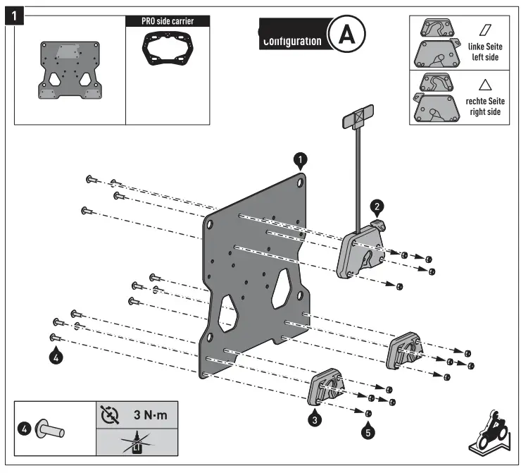 NOTE: The following mounting steps show the mounting of the left side carrier. Mount the right side carrier in the same way. Attach the parts (2) to (5) to the side carrier (1). ATTENTION: Use a liquid thread locker! Tighten the screws as specified.