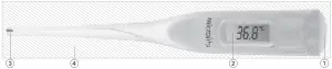 For disinfection in home use environment, use a 70% Isopropyl alcohol swab or a cotton tissue moistened with 70% Isopropyl alcohol to wipe surface pollutants off the thermometer probe. Always start wiping from the end of the thermometer probe (approx. at the middle of the thermometer) towards the thermometer tip. Afterwards the entire thermometer (see number ④ in the drawing) should be immersed in 70% Isopropyl alcohol for at least 5 minutes (max. 24 hours). After immersion, let the disinfectant dry off for 1 minute before next use.
