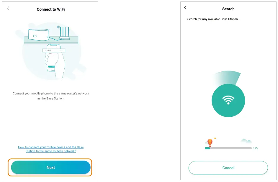 Connect your mobile phone to the same router’s network as the base station, and tap Next.