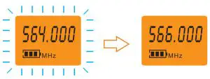 5) The screen of the transmitter stop flashing, the frequency of the transmitter has been changed from flashing 564.000Mhz to other available frequency. The blue indicator of the receiver is on and stays on blue light. Transmitter and receiver paired successfully.