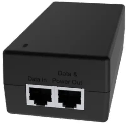 - Insert the other end of the cable into the PoE injector Data & Power Out port. Plug the PoE injector into an earthed AC outlet.