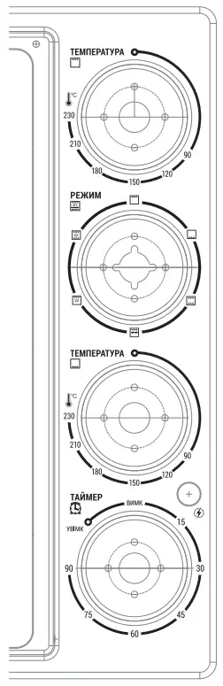 - Thermostat knob: choose desired temperature from Low- 90°С- 230°С (Low is cooking at the room temperature.)
