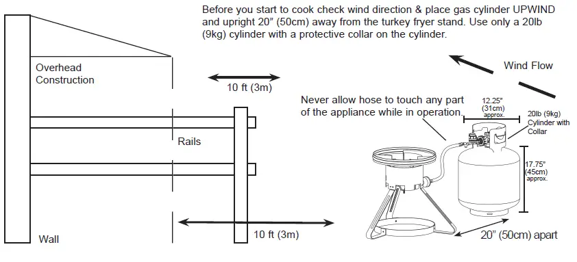 - Never operate this appliance within 10 ft (3m) of any structure, combustible material or other gas cylinder.
