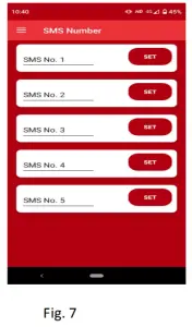 To set SMS numbers in system click on SMS No. 1 enter 10 digit mobile number and click on [SET] button. Host will give confirmation beep after receiving the message, and reply message to mobile phone automatically, which means the “SMS number saved successfully”.[ Fig.7 ].