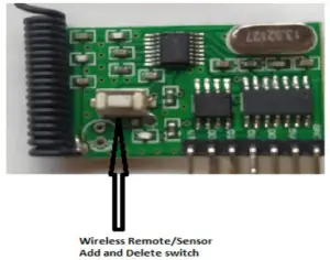 - Wireless Remote: Press wireless Remote/Sensor Add and Delete switch “Red LED” will turn ON then press any key on wireless remote. Remote will add successfully.