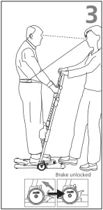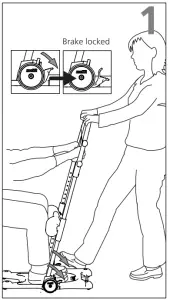 - Lock both wheels by pressing down the brake on one side. Both wheels lock regardless of which side assistant steps on. Place one foot on the edge of the base plate. Choose a grip on the handle that is comfortable for both assistant and the user.