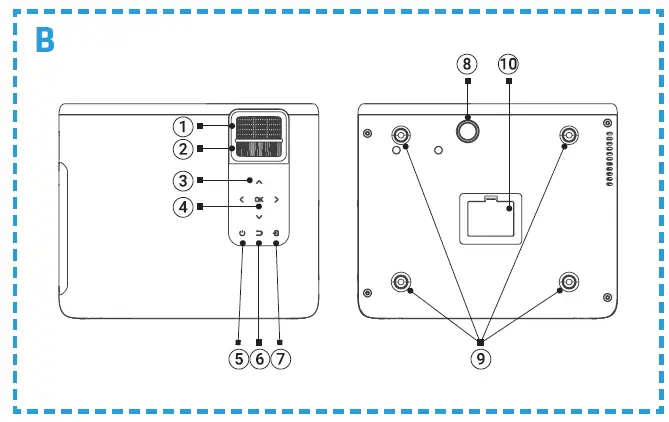 - To ensure free heat dissipation, before operating the projector, adjust the height using the knob (8, fig. B).