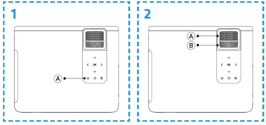 - Push the on/off button on the remote controller or projector (A, fig. 1).The indicator light will be lit solid blue.