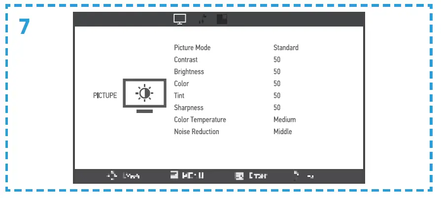 Push the menu button on the remote controller (4, fig. C) to move to the menu settings. Set the selected display (fig. 7) and sound (fig. 8) parameters, as preferred.