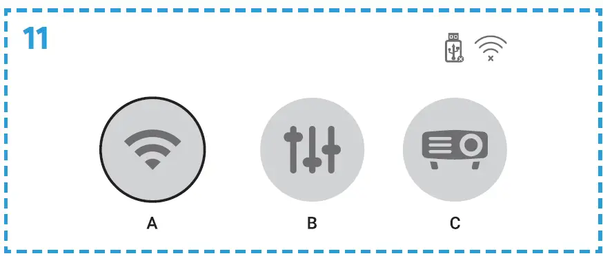 - On the iOS device, open the telephone and then select the “Screen mirroring” function (A, fig. 9).When the device is scanning for the projector (B, fig. 9), select NETLINK-XXXX-(icast) from the list of available devices (C, fig. 9).The final four digits of the device name are generated at random.