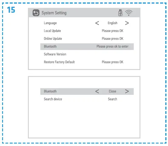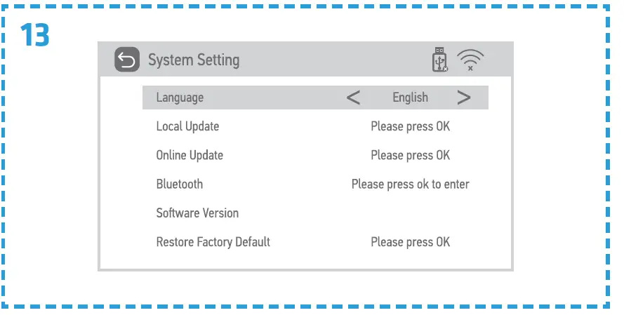 - In System settings, you can change the language and software version, connect via Bluetooth, restore factory defaults and complete local or online update (fig. 13).