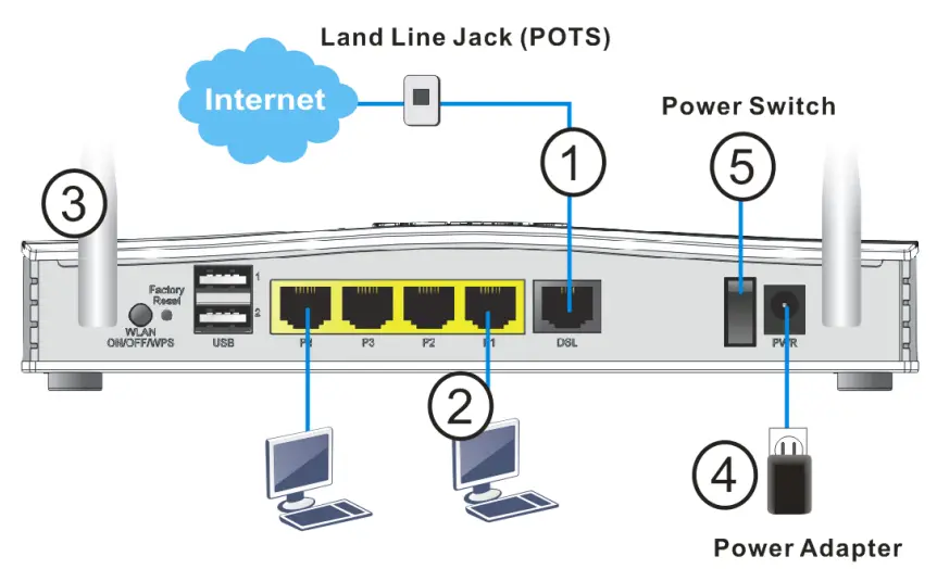 - Connect the DSL interface to the land line jack with a DSL line cable.