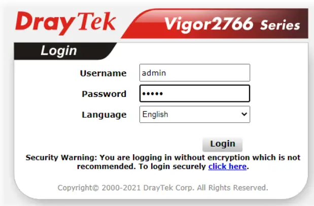 Open a web browser on your PC and type http://192.168.1.1. A pop-up window will open to ask for username and password. Please type “admin/admin” as the Username/Password and click Login. Here, we take Vigor2765 series as an example.