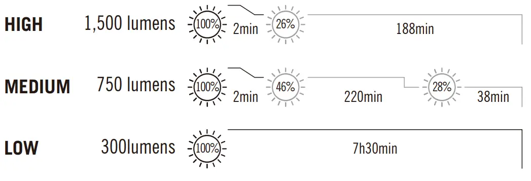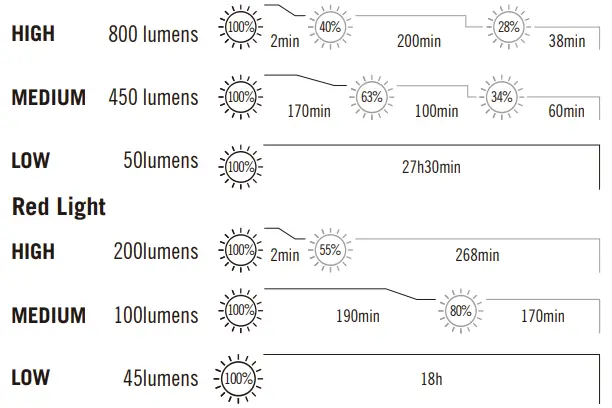 CHANGE BRIGHTNESS LEVEL: When the headlamp is on, press and hold the switch to change brightness level. The output brightness will cycle through Low → Medium→ High →Low… until the switch is released.