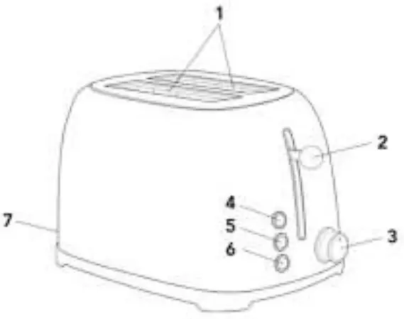 - The toaster gets hot during use, do not touch the sides or the hot parts when the toaster is on. Be careful when removing the bread from the toaster.