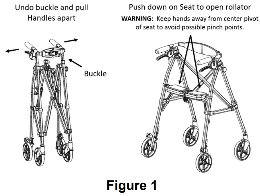 To open the rollator, undo buckle, pull handles apart, and push down on the seat as shown in Figure 1.