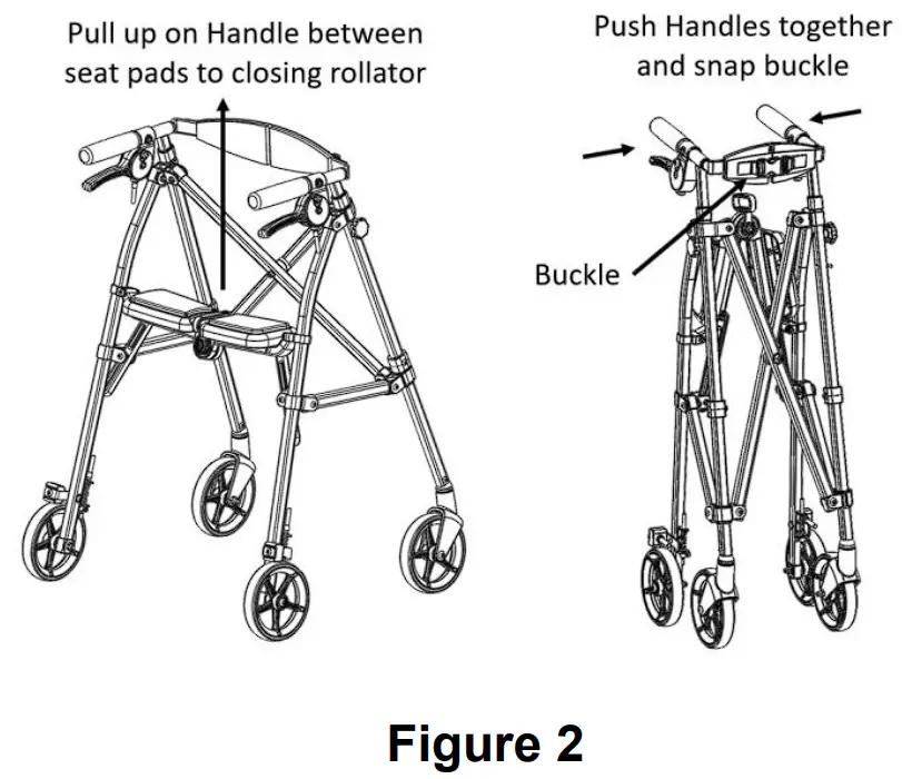 To close the rollator, pull up on the handle between the seat pads. Push handles together, and snap the buckle as shown in Figure 2.