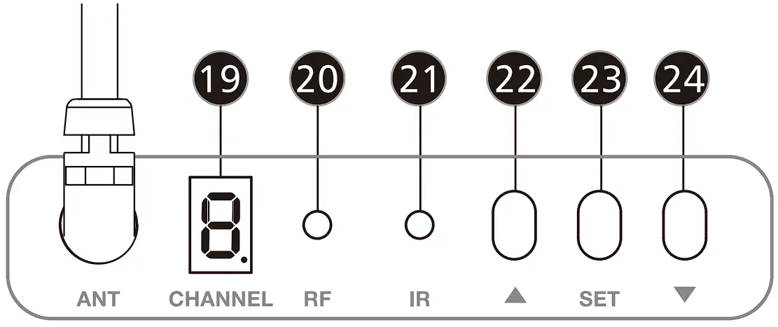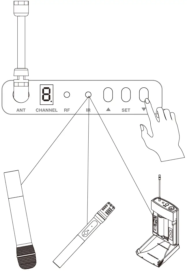 Power on you receiver, press and release the UP or DOWN button to select the channel code you perfect manually, Then press and hold the UP button to enter pairing mode, while press and hold DOWN button, it not only enters pairing mode but also find the cleanest channel by automatic scanning. Power on your transmitter, Then place the IR port o receiver to face towards the IR lens of transmitter within 20 CM distance. Once TX and RX are paired successfully. the RF indicator on receiver will light solid.