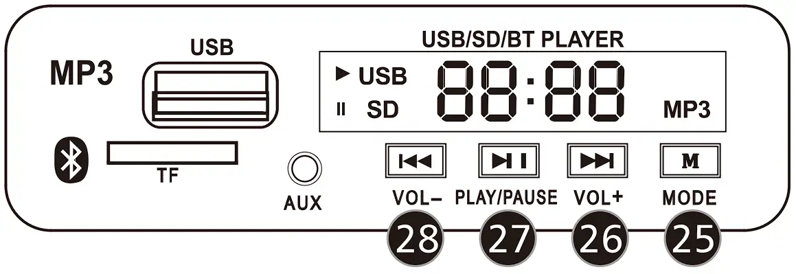 | Built-in player | MP3 and Bluetooth |