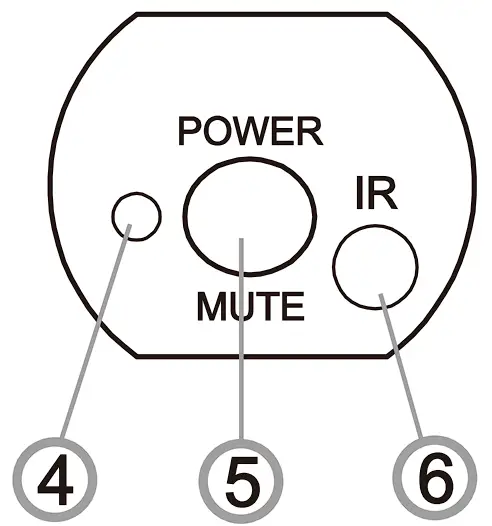 To turn on or off, keep this button pressed. To enter “MUTE” mode press and release this button. - Infrared (IR)This window is used to capture the infrared signal sent from the receiver. During IR adjustment