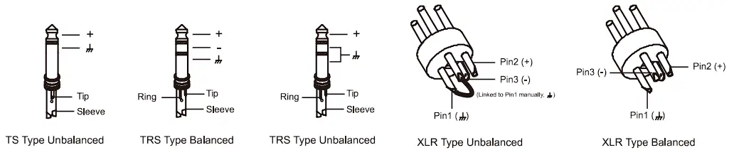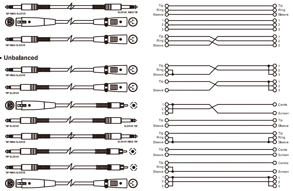 Both connectors, 1/4” XLR or TRS, can be wired in balanced or unbalanced way, depending on the work necessity. The following ones are examples of how these connectors can be wired: