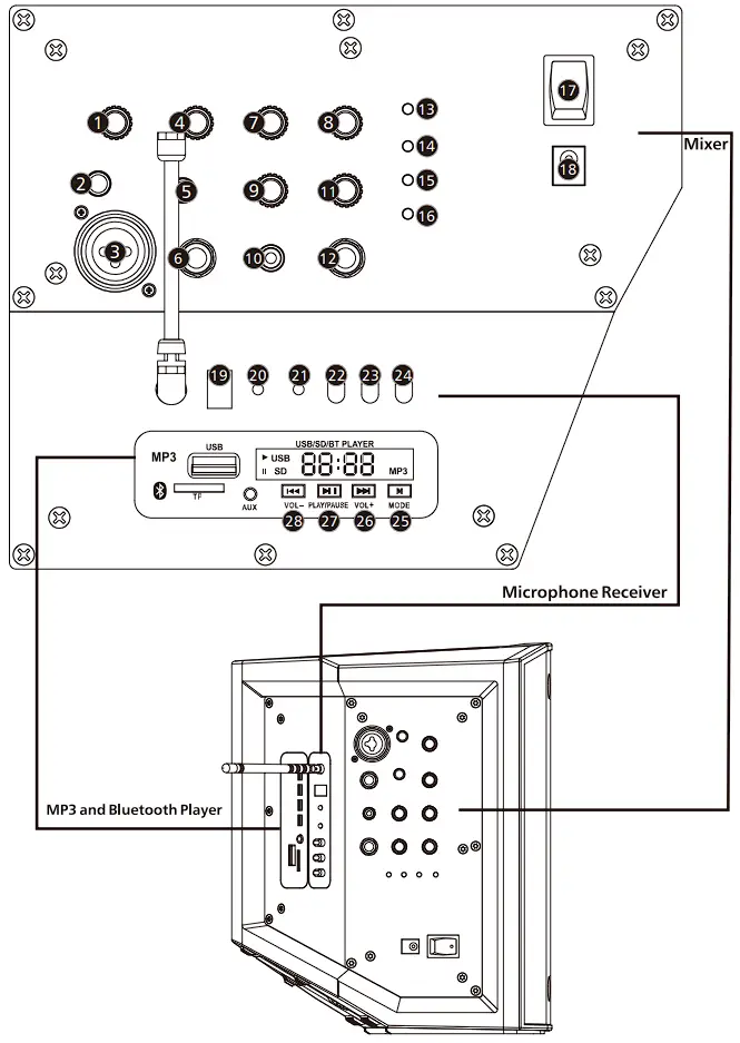 | External Controls | Master Volume; MIC & LINE Switch; Hi-Z & LINE AUX each Volume Controls; Voice priority Switch; Power Indicators; Recharged Indicators Low Battery level Indicators |