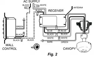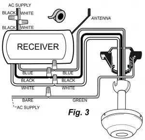 CONNECT: TO: GREEN fan wire BARE supply wire BLACK receiver wire (AC IN L) BLACK supply wire WHITE receiver wire (AC IN N) WHITE supply wire WHITE receiver wire (TO MOTOR N) WHITE fan wire BLACK receiver wire (TO MOTOR L) BLACK fan wire BLUE receiver wire (FOR LIGHT) BLUE light wire (from fan) Wrap each wire connector separately with electrical tape as an extra safety measure. If other fan or supply wires are different colors than those mentioned, have this unit installed by a qualified electrician.