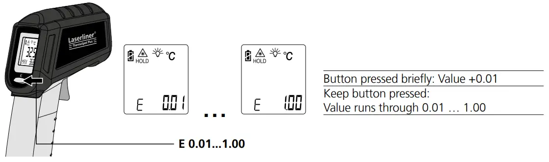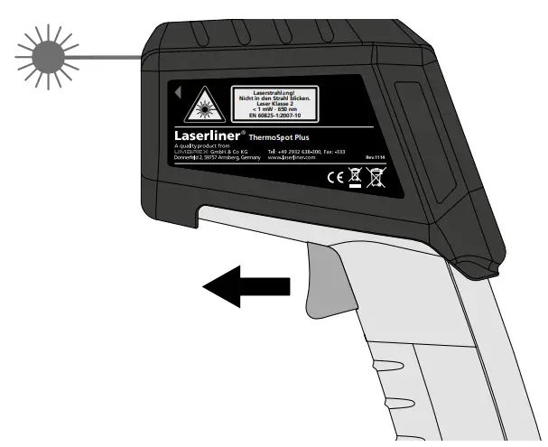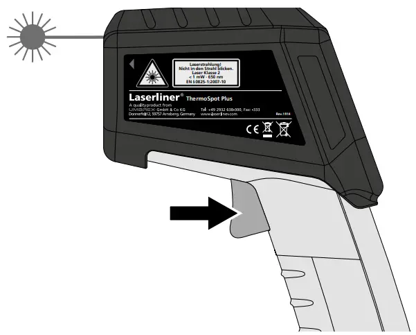 For continuous measurement activate the laser (see figure) and keep the button pressed.