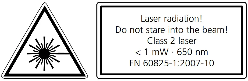 | Read the operating instructions and the enclosed brochure „Guarantee and additional notices“ completely. Follow the instructions they contain. This document must be kept in a safe place and if the laser device is passed on, this document must be passed on with it. |