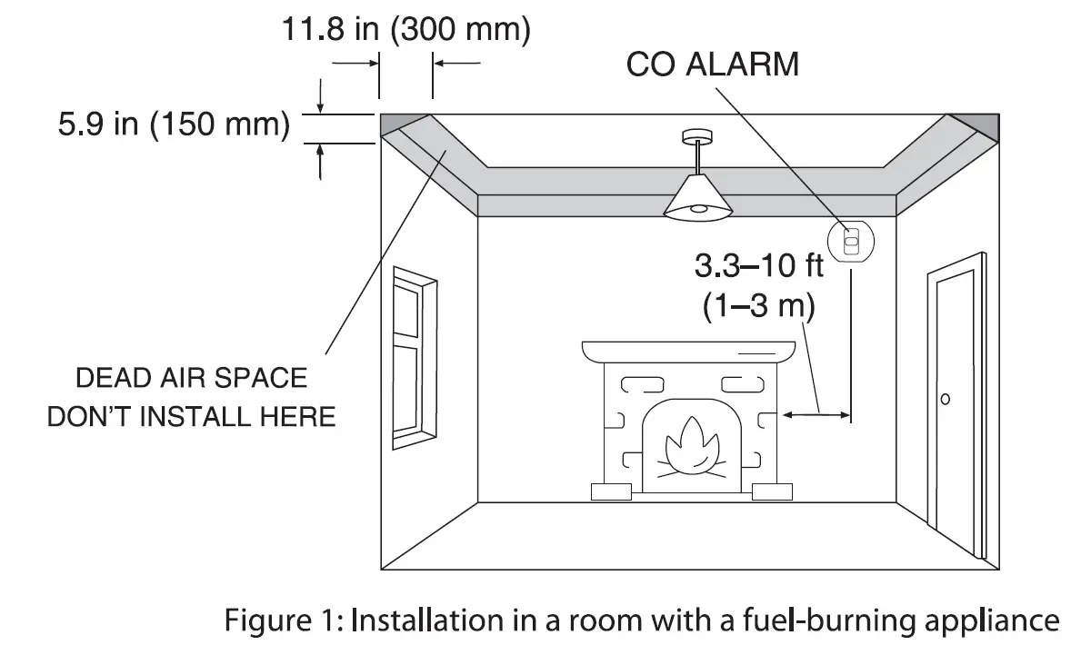Installing a CO Alarm in a Room with a Fuel-Burning Appliance (See Figure 1 and Figure 2):