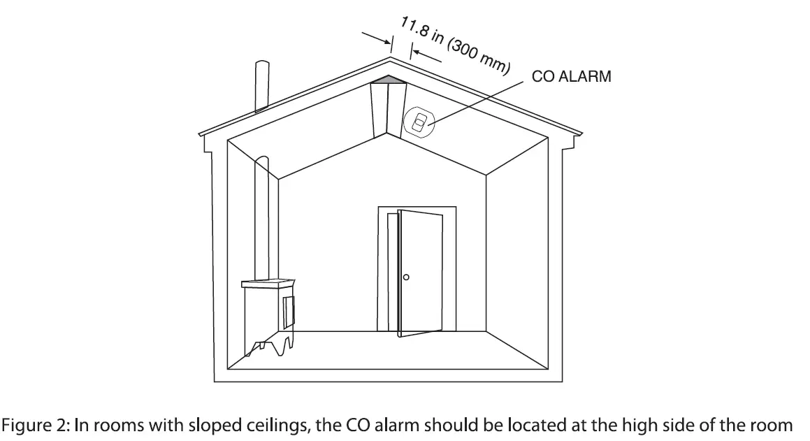 - In rooms with sloped ceilings, the CO alarm should be located at the high side of the room (see Figure 2).