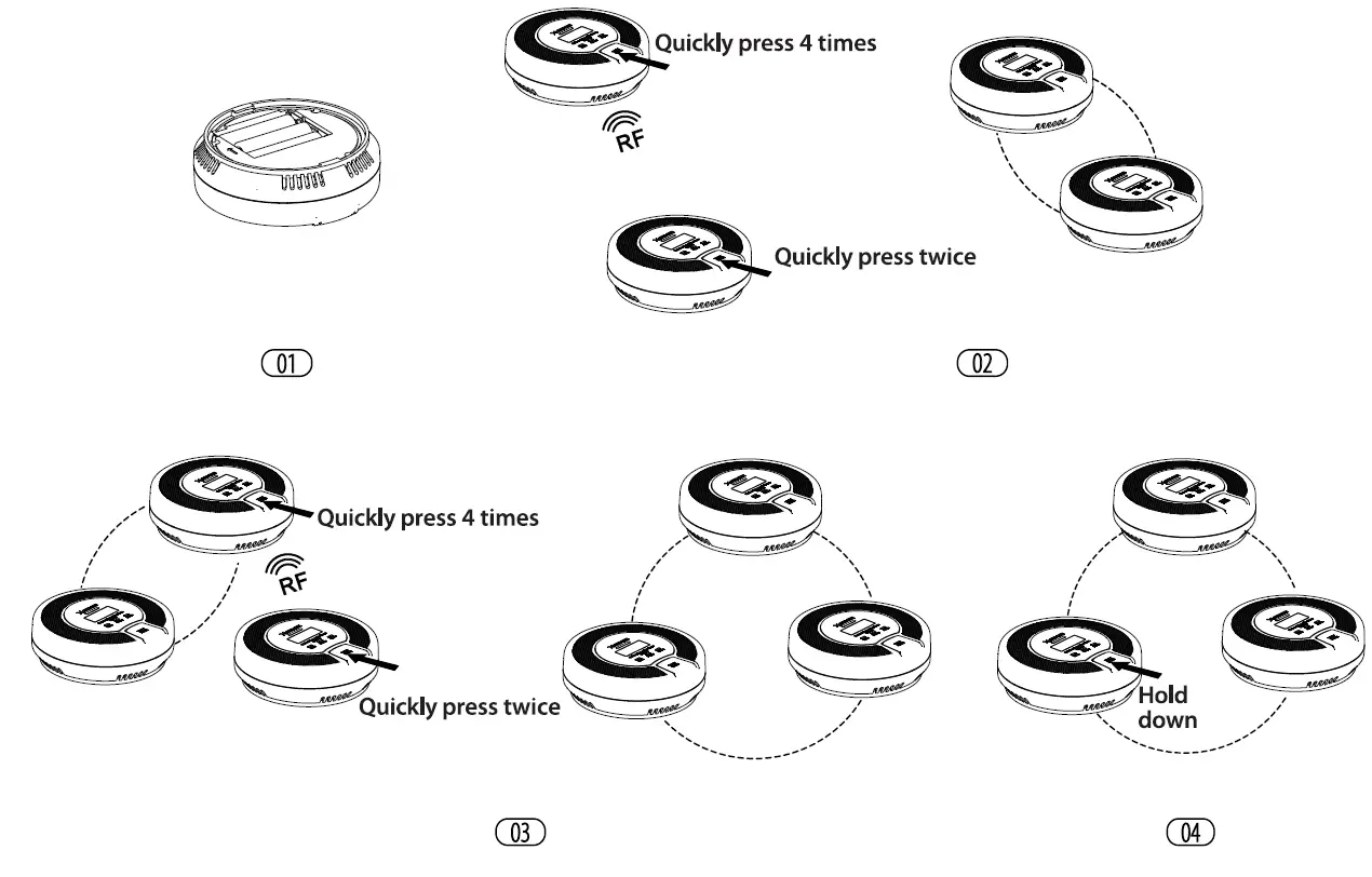 - If you want to connect more units, simply repeat step 4. Up to 24 alarms can be interconnected this way. To ensure that all alarms enter the same interlinked network, make sure you only work with 2 units at a time-one unit enters the pairing mode and the other unit enters the searching mode,