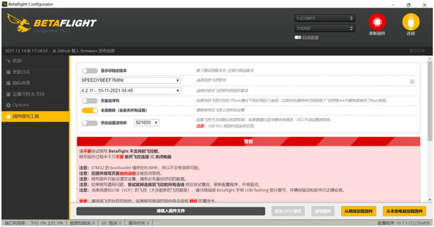 ③ Open Betaflight/ Emuflight/lNAV configurator on the PC, go to the ‘Firmware Flashing’ page, choose the target ‘SPEEDYBEEF7MINI’ and flash.