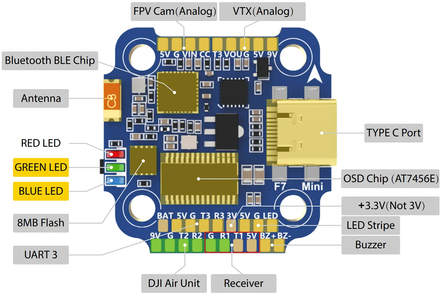 BLUE LED – Flight controller status light which is controlled by the flight controller firmware. - BOOT Button
