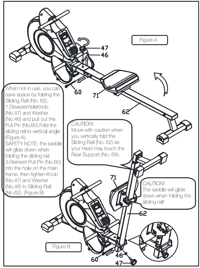 Next, fix the top of the Sliding Rail (No. 62) to the Main Frame (No. 44) using 1 Knob (No.4 7) and 1 Washer (No.46) then insert the Pull Pin (No.60).