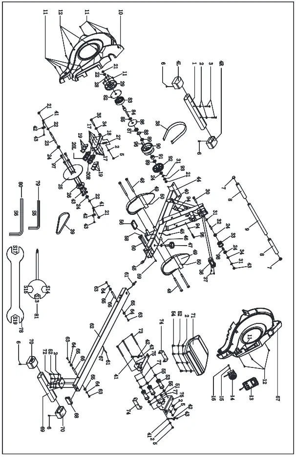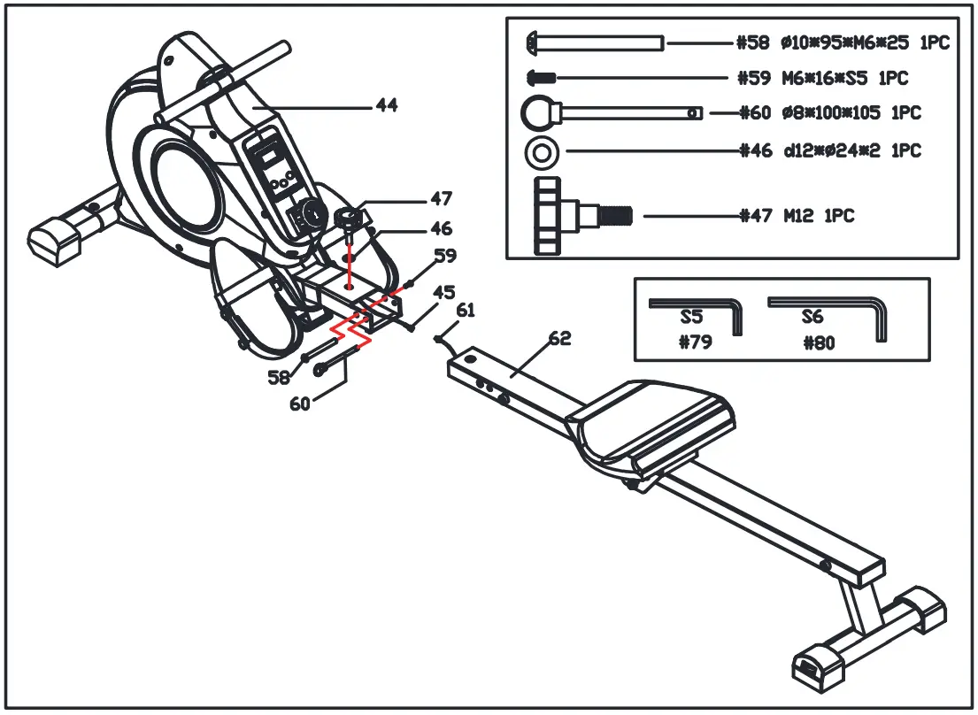 Attach the Sliding Rail (No.62) to Main Frame (No.44) using 1 Bolt (No.58) and 1 Screw (No.59). Tighten and secure with Allen Wrench (No. 79) and Allen Wrench (No. 80).