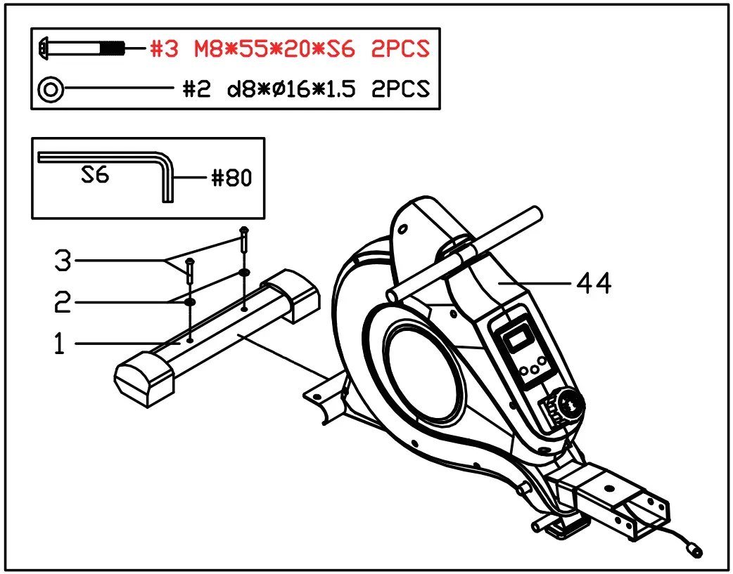Attach the Front Stabilizer (No.1) to the Main Frame (No.44) using 2 Screws(No.3) and 2 Washers (No.2). Tighten and secure with Allen Wrench (No.80).