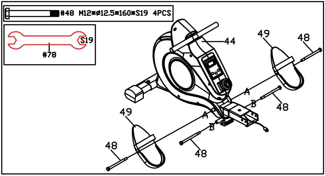 Attach the 2 Bolts (No.48) into the upper hole in position A of the Main Frame (No.44) through the Pedals (No.49) and tighten with Spanner (No.78).